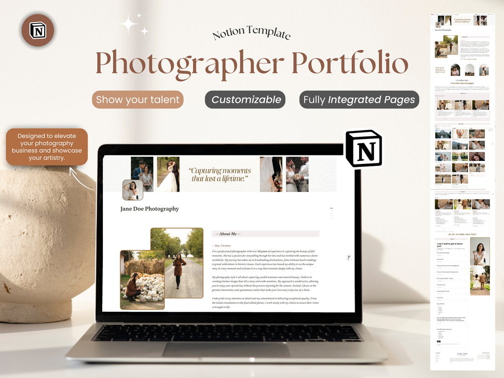 Elevate your photography business with our comprehensive Photographer Portfolio & Admin Dashboard Notion Template. This all-in-one solution is designed to showcase your stunning work, manage client inquiries, present your service packages, and display glowing testimonials, all in one place. Say goodbye to costly website developers and designers – your professional photography portfolio will be online in seconds and completely free.