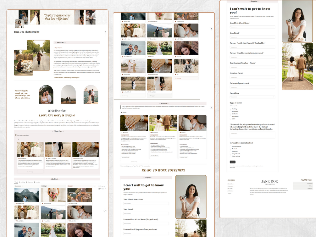 - Weddings, Elopements, Portraits: Present detailed descriptions, pricing, and features of your services.
